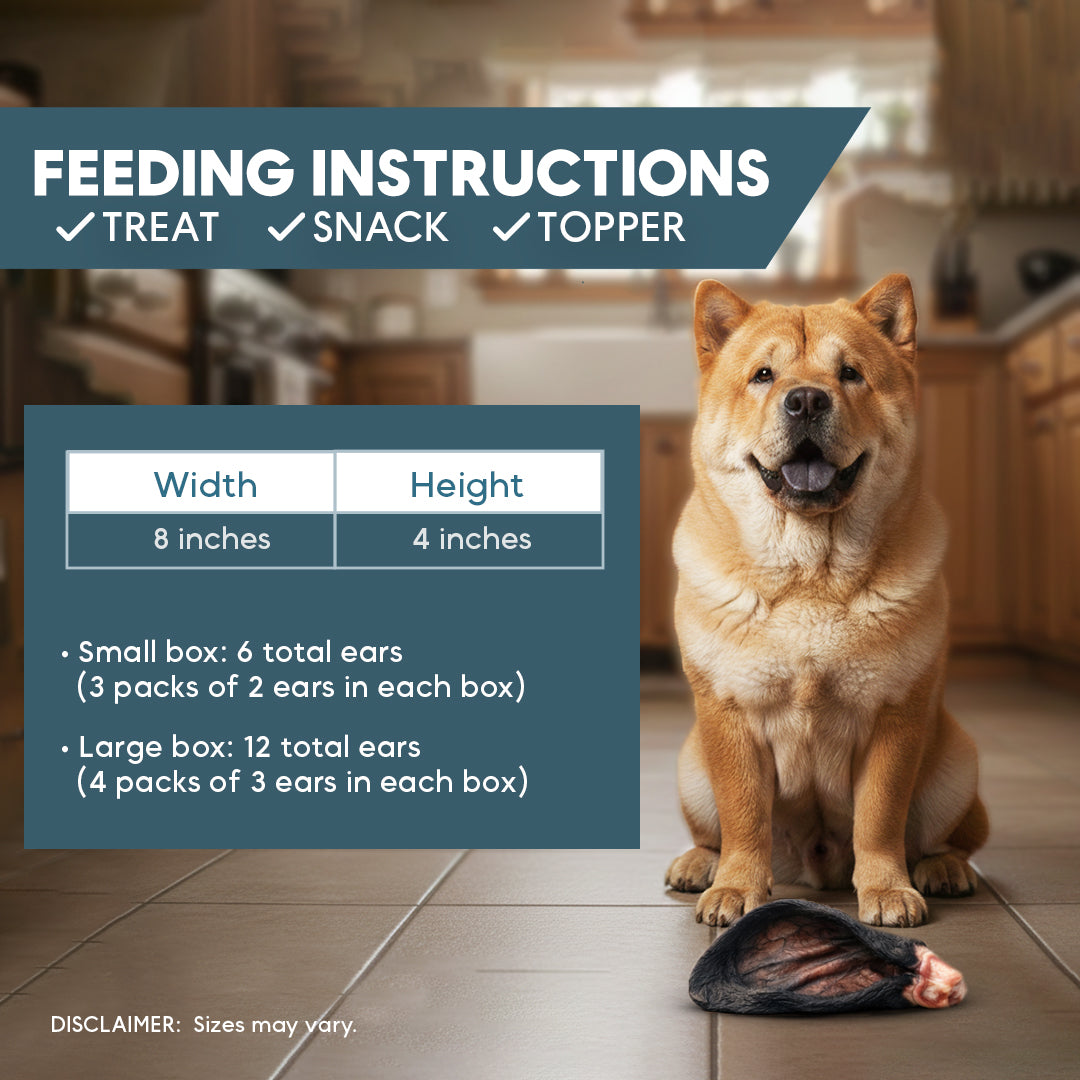 Note: Weight may vary due to the natural variation in ear size. We recommend rinsing these ears off in a water & apple cider vinegar solution prior to feeding or dehydrating. Always provide fresh water and supervise while feeding.